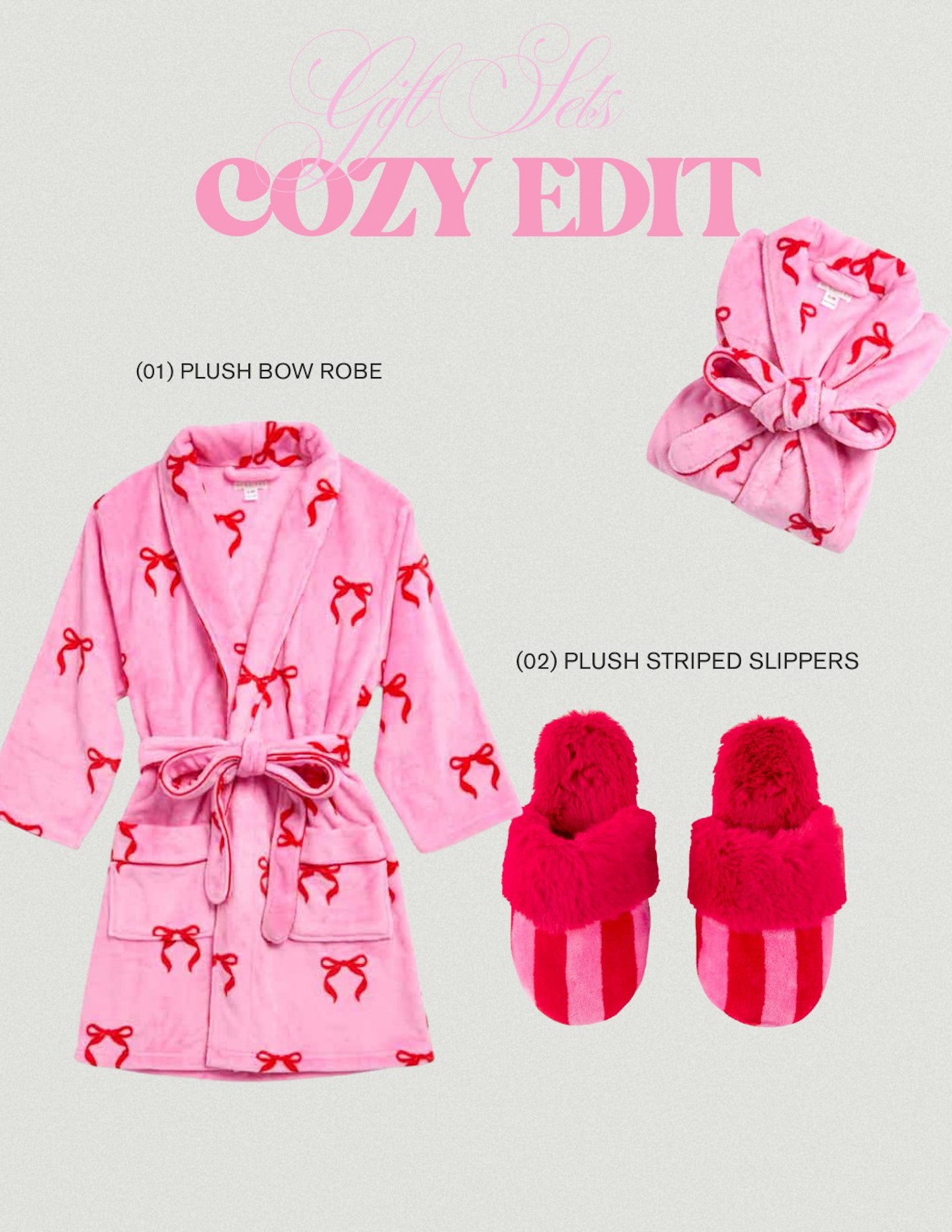 Perfect for the cozy homebody on your list, this bundle features the sweetest pink robe, paired with striped plush slippers for head-to-toe comfort. Each piece works together to create the ultimate stay-in-style gift set!