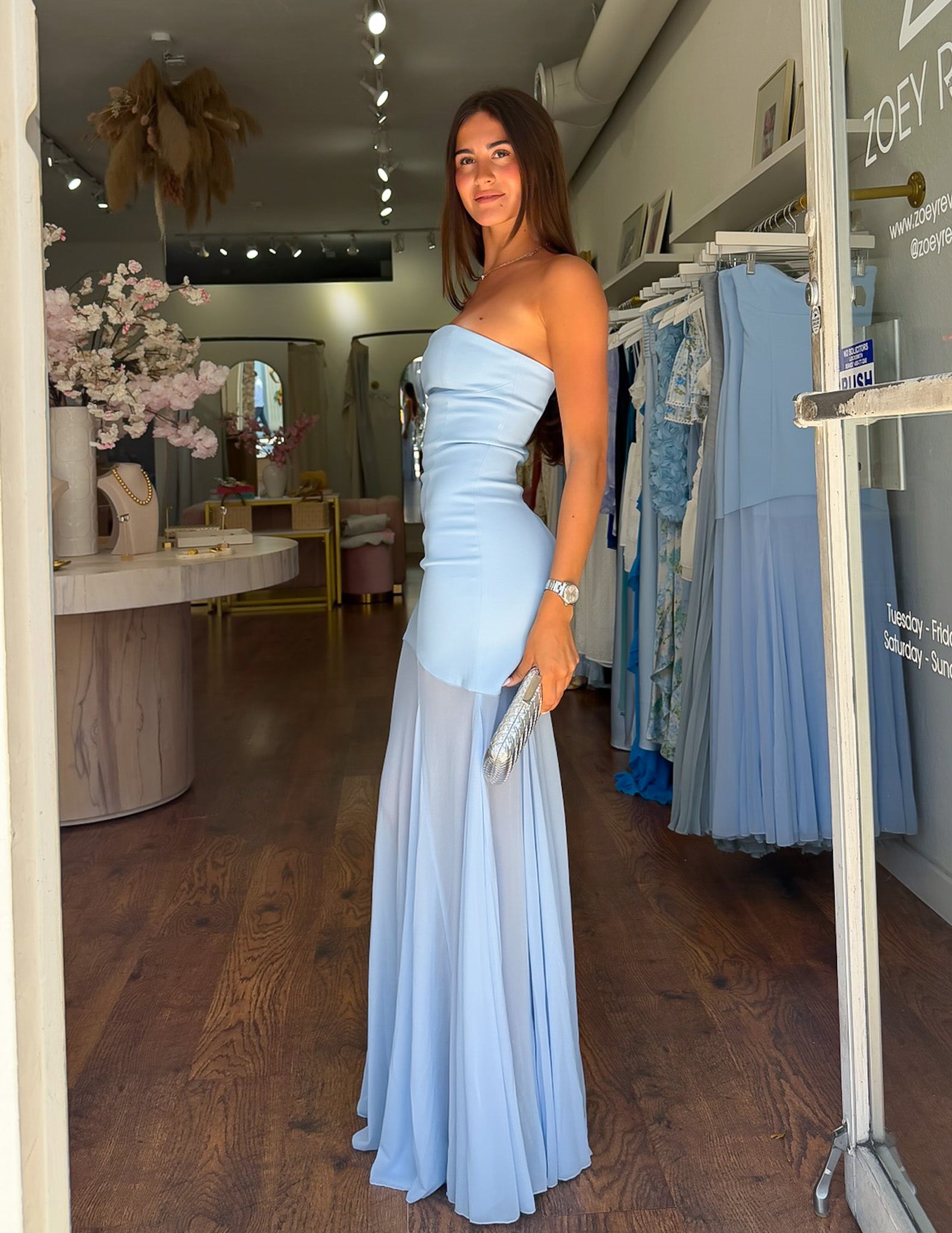 Flowing and feminine, our Seraphina Maxi Dress features a structured bodice with a sheer, flowing skirt, perfect for weddings, formals, or summer soirees.